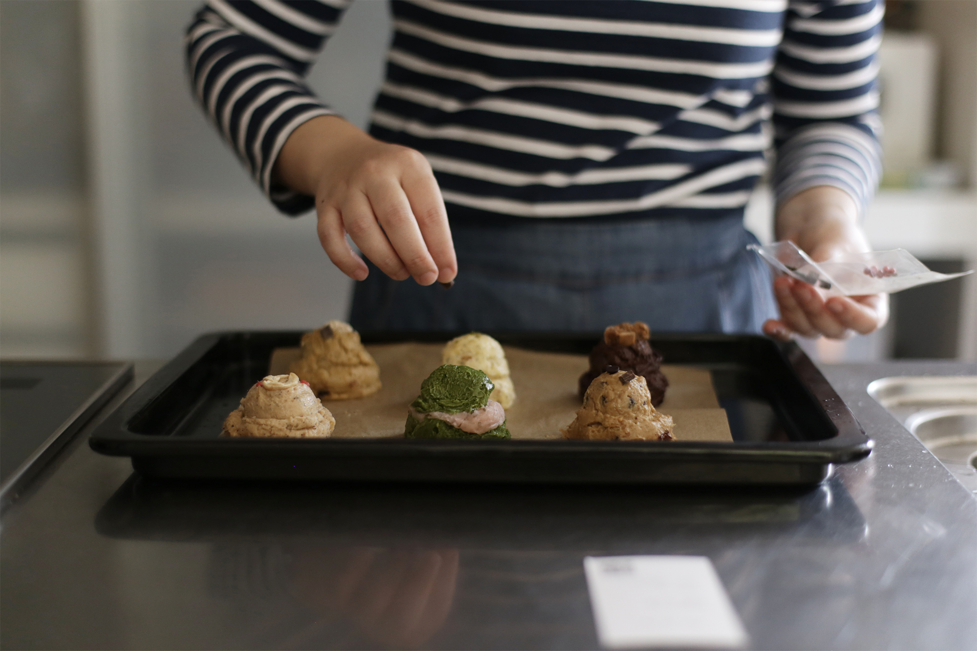 「おうちで焼こう!シェアクッキー」は、ただ届けて食べてもらうだけではなくて、作る楽しさも一緒に体験できるように考えられた商品だそう。アイスクリームのようにも見える生地で届きます。これだけでも美味しそうですが、まだ食べれません。これを並べて焼きます。注意なのが、焼くと大きくなるので、置くときの間隔は10cm程度離した方がいいそう。この写真は近すぎました~(汗)。